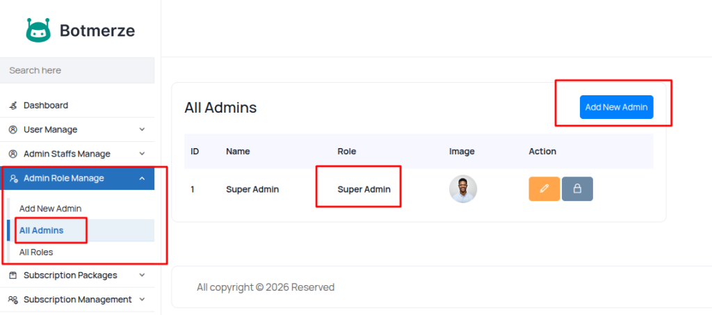 You can manage all admin roles easily,” Admin Role Manage > All Admins”.