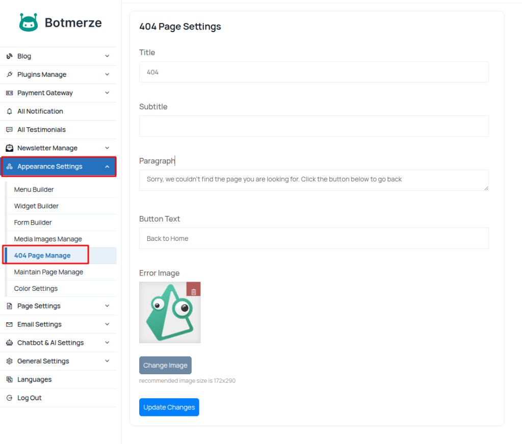 404 Page Manage This cms you can manage the 404 page easily, go to ” Appearance Settings> 404 page Manage”. Doc navigationColor Settings → Was this article helpful to you? No Yes How can we help? Name Email Subject Message