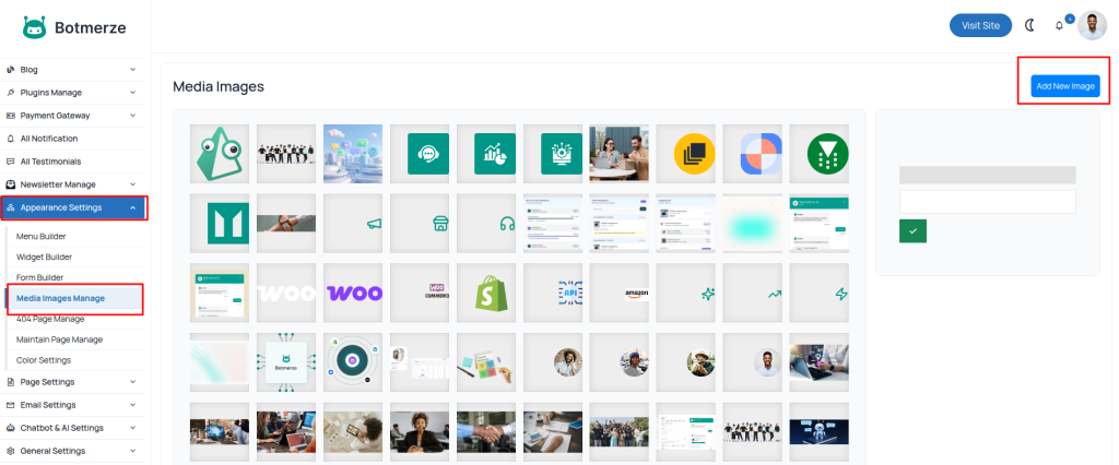 In this CMS, you can easily manage Media Images; go to ”Appearance> Media Images> Manage”.