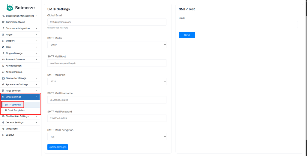 To set your own SMTP settings, go to “Email Settings > SMTP Settings”. You will see the settings below.