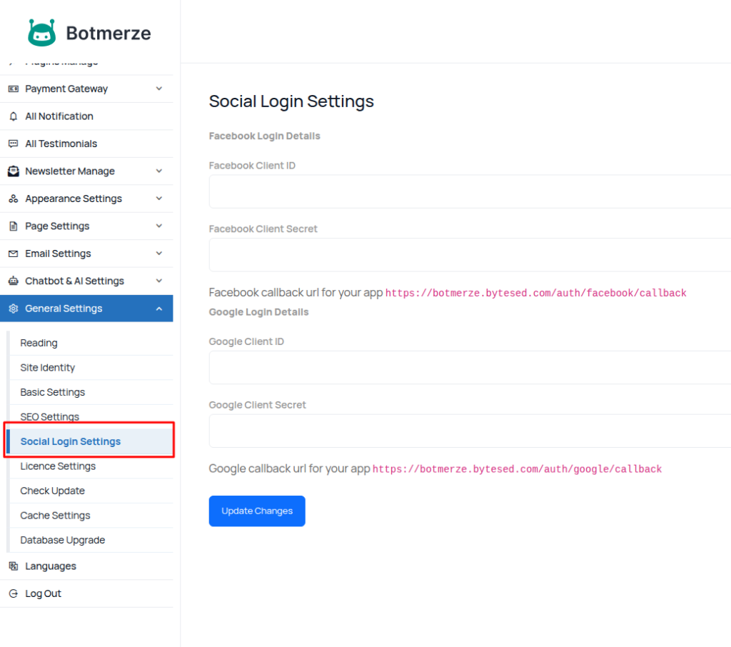 You can configure the social login credentials for Facebook and Google in the “Social Login Settings” section under General Settings.