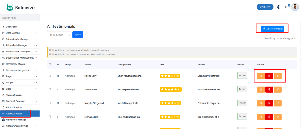 From this page, the admin can view and manage all user reviews and testimonials. You can also add a new review anytime using the “Add Testimonial” button located at the top-right corner of the page.