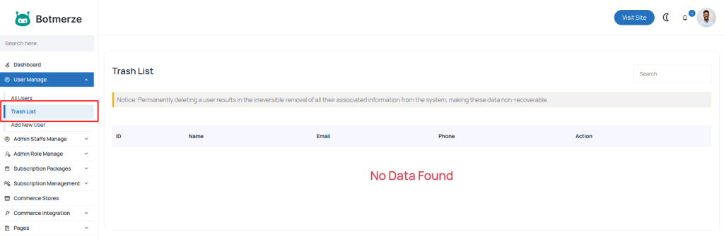 Trash List You can easily manage Trash List from the admin panel under “User Manage -> Trash List” Was this article helpful to you? No Yes How can we help? Name Email Subject Message