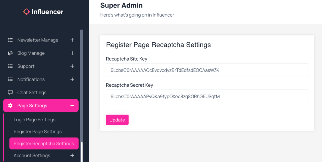 Step 09: Now you have to add those captcha keys to admin panel “Page Settings->Register Recaptcha Settings”